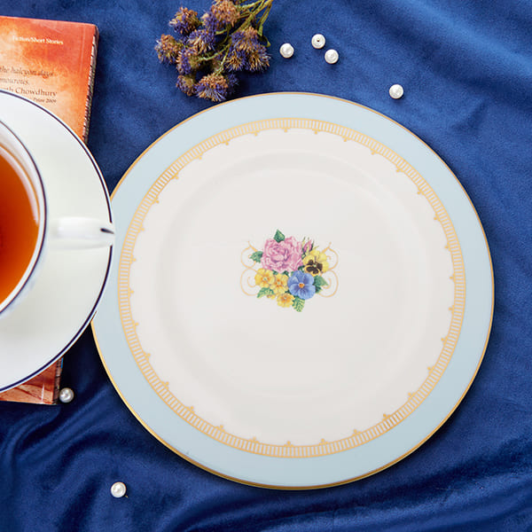 Halcyon Days Shell Garden floral blue 8 inches dessert plate from Halcyon Days is inspired by the Castle of Mey in Scotland, a much-loved holiday destination of Her majesty Queen Elizabeth The Queen Mother. Halcyon Days have collaborated with the Gardens and Trust to form the delightful Shell Garden Floral collection.