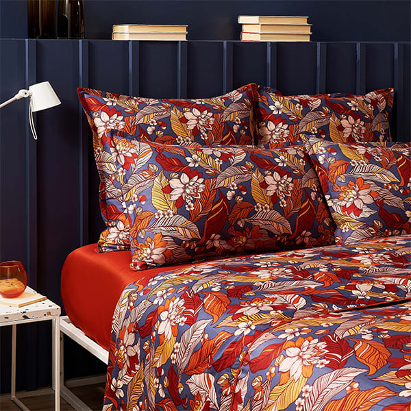 Satin 110 threads/cm², 100% organic cotton, tight weave. Face printed multicolored floral pattern, warm winter atmospheres on deep blue background. The model is combined with plain bed linen.