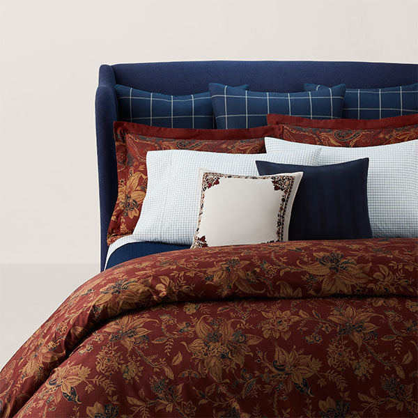 Inez Paisley Duvet Cover from Ralph Lauren Home. Inspired by the opulent English Jacobean Period, known for its intricate floral designs and lavish details, this duvet cover features a beautiful paisley pattern. Made from soft 300 thread-count cotton sateen, it ensures comfort and quality.