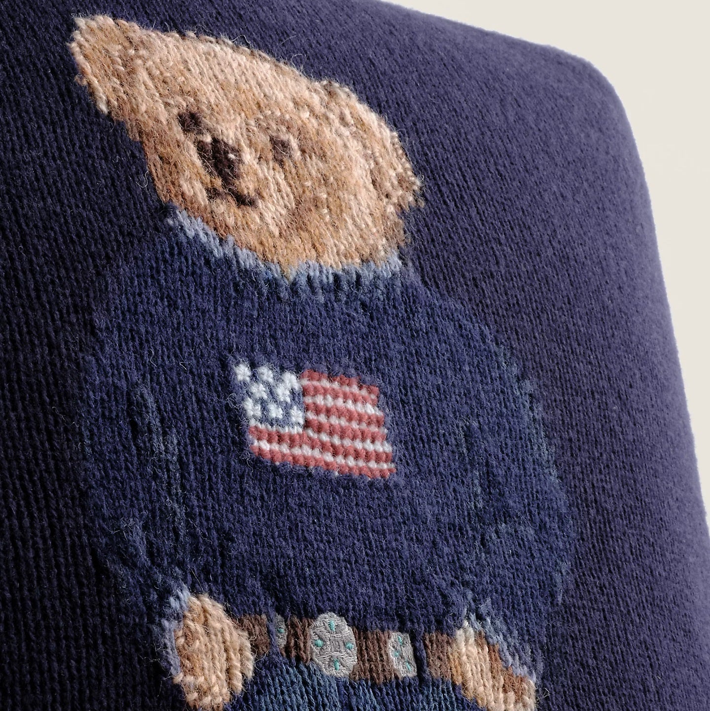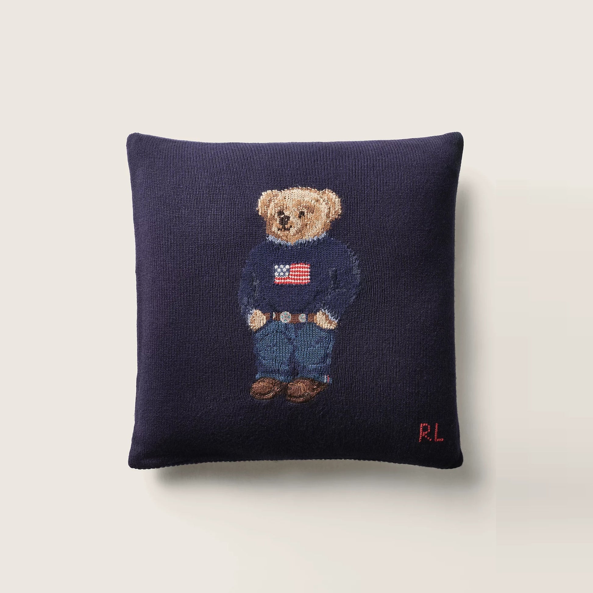 The Polo Bear is depicted wearing loafers, jeans, a concho belt, and an American flag sweater, exuding classic Americana charm. On the front of the pillow, you'll find the signature Polo Bear and "RL" knit, adding a touch of sophistication to any space. The back features a solid-hued design for versatility.