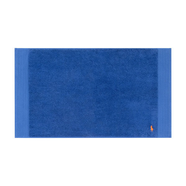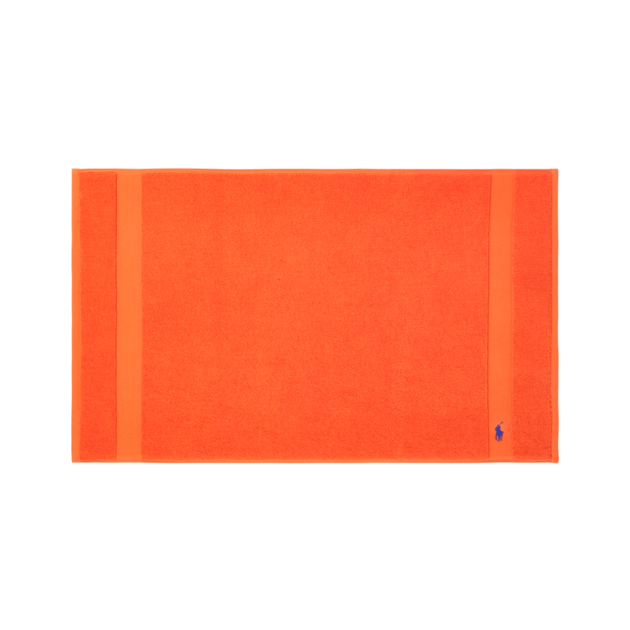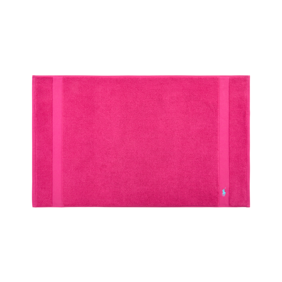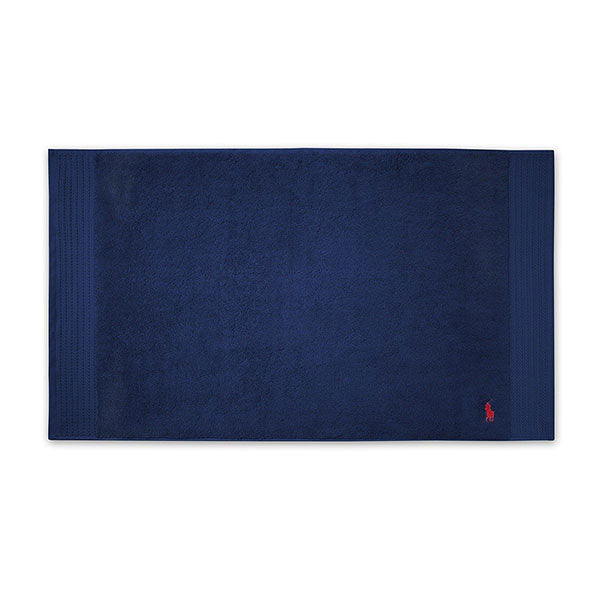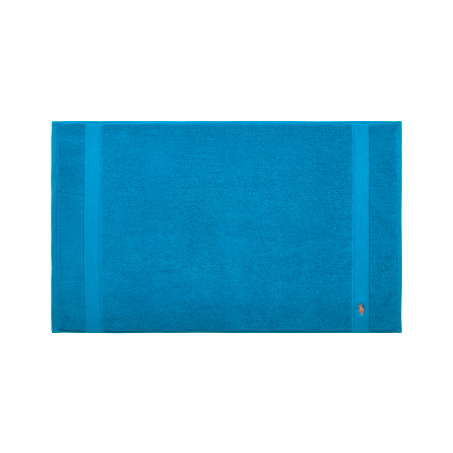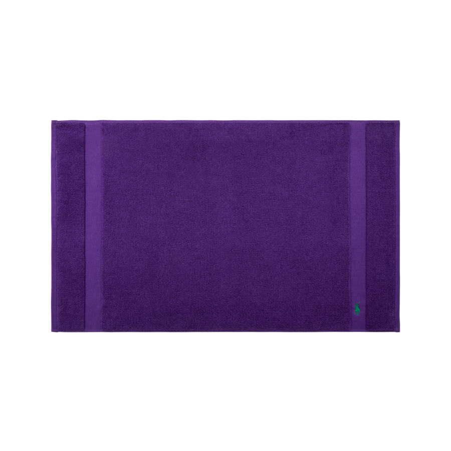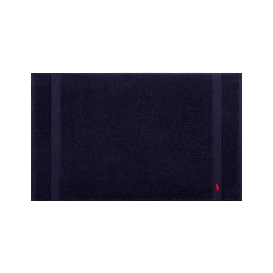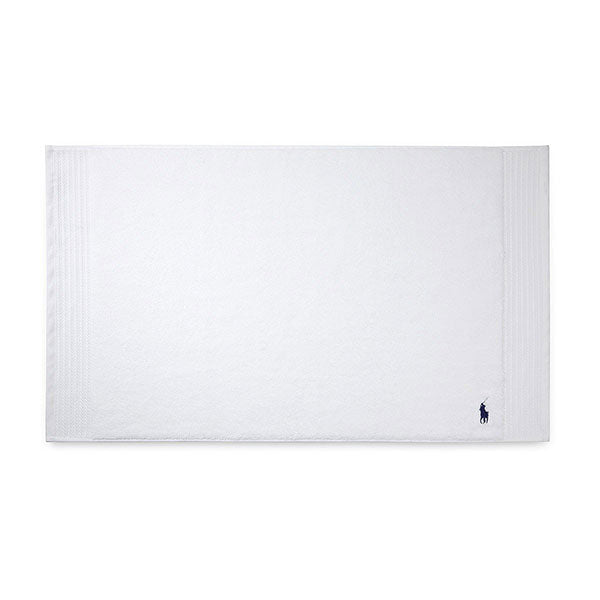 The quintessential Polo Player bath mat, a cornerstone of luxury within the Ralph Lauren brand. This bath mat is adorned with a distinguished border on each side and meticulously embroidered with the iconic polo player emblem in a striking contrasting shade.Pair it effortlessly with matching towels and robes from the Polo Player collection to create a cohesive and indulgent bathing experience.