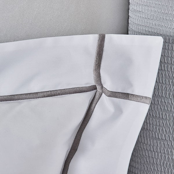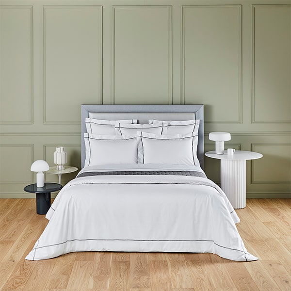 A signature flat sheet from the Yves Delorme range, Athena. Crafted from a silky smooth yet crisp long staple cotton percale, the white sheet is decorated with thin vertical and horizontal lines in a textured bourdon stitch using a sateen thread, which frames the entire design.