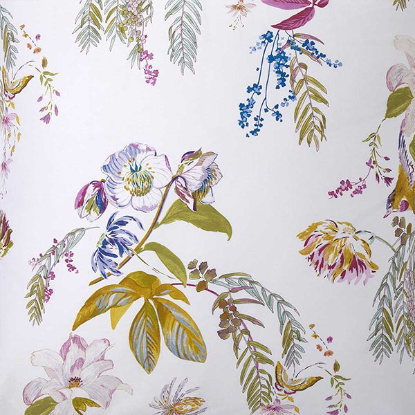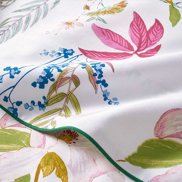 A romantic flat sheet covered in a floral print inspired by French gardens. The diverse flora depicted includes the likes of peonies and magnolia flowers, joined by passing butterflies. The design is finished with contrasting piping in an emerald green hue.