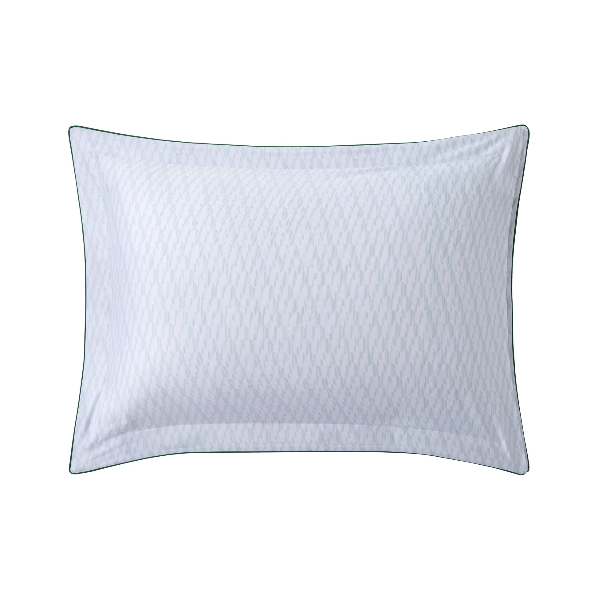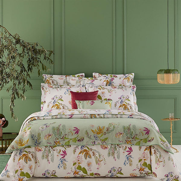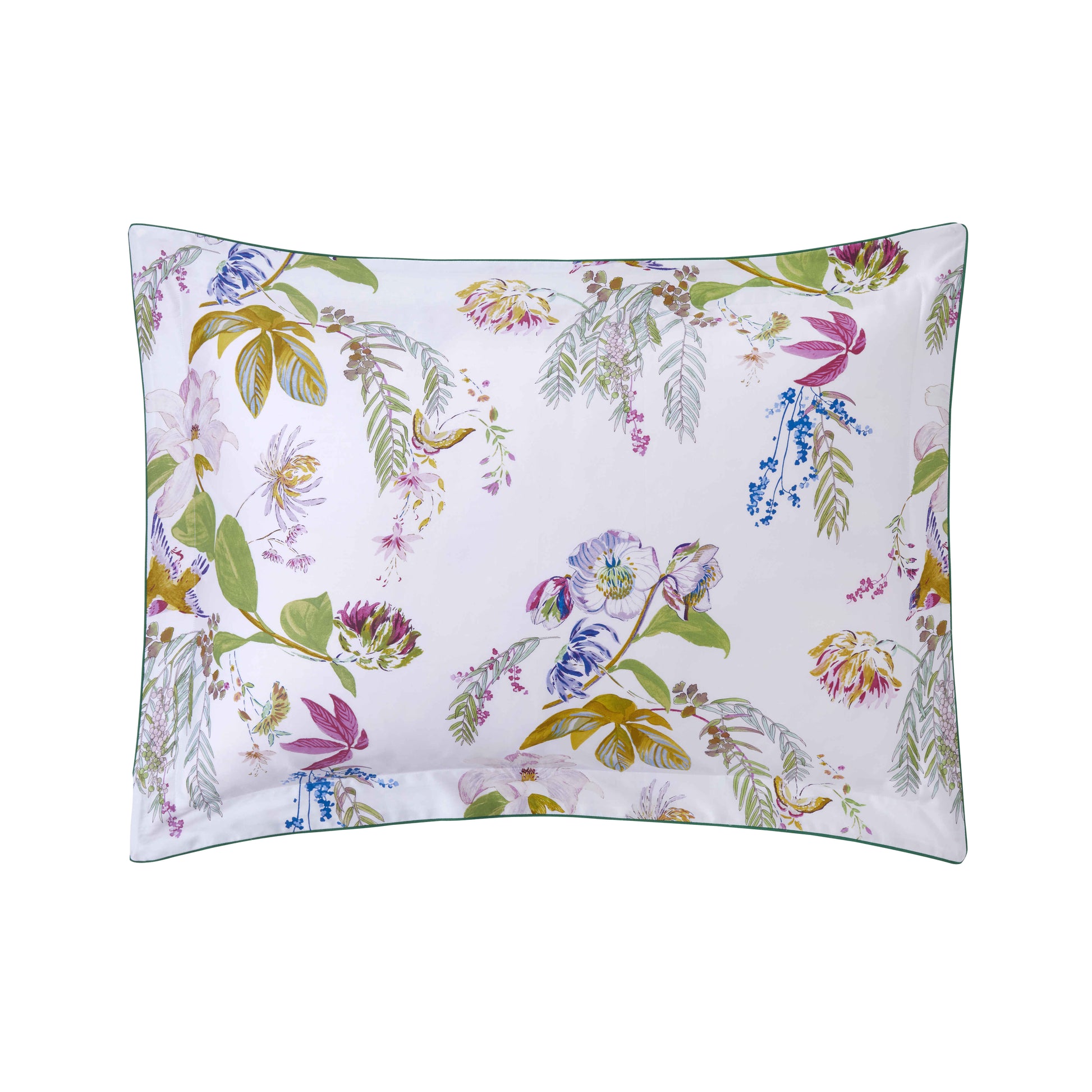A double-faced Oxford pillowcase celebrating all the flora found in a French garden. The front design of the case is decorated with a vibrant colour palette of scattered blooms and greens like magnolias and willow shoots with a butterfly sitting atop, set against a white backdrop. In the meantime, the reverse side is printed with a simpler geometric design in white and green. This is all tied together and framed with a contrasting piped finish.